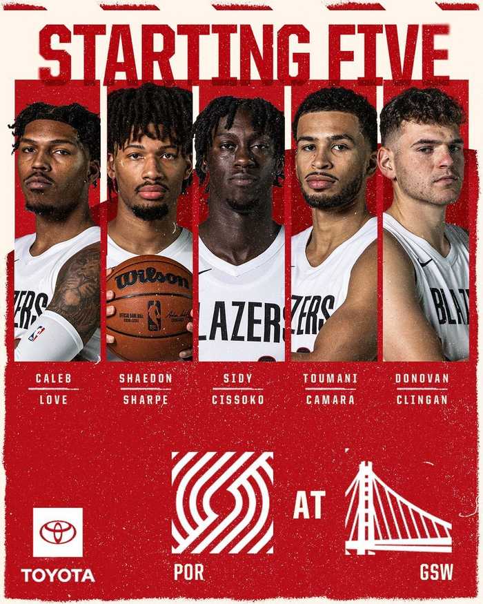 开拓者官方账号报道,本场比赛在勇士主场的首发五人名单已公布。5️⃣